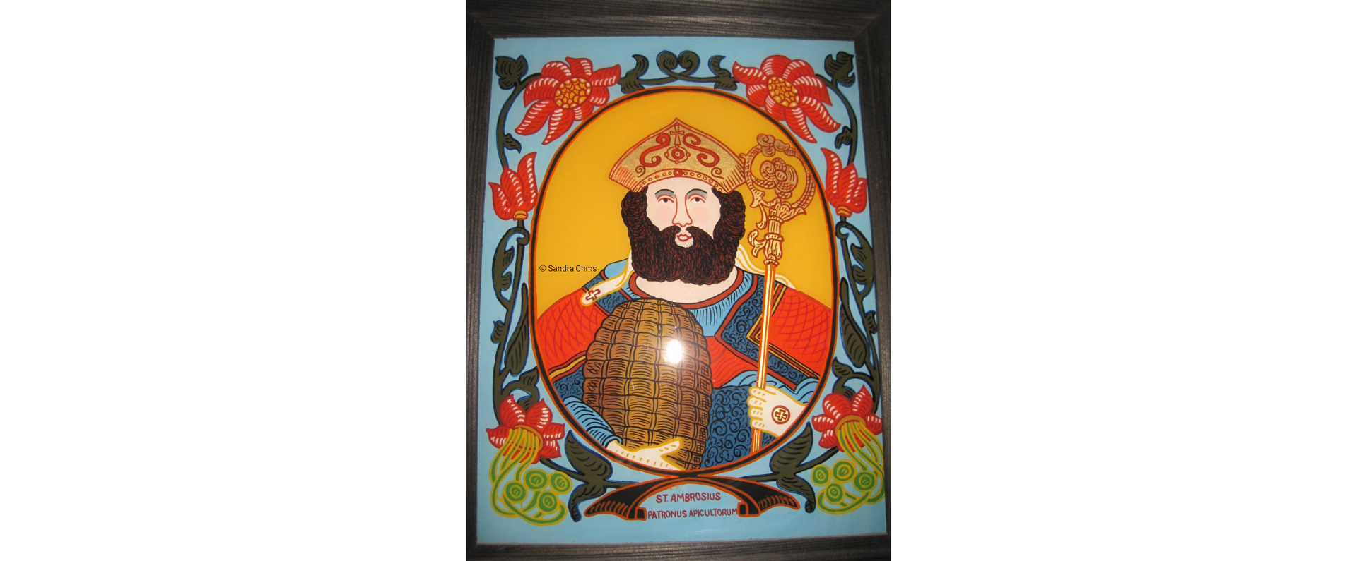 Der heilige Ambrosius ist der Schutzpatron der Städte Mailand und Bologna, der Krämer, Imker, Wachszieher und Lebkuchenbäcker sowie der Bienen und Haustiere. Seine Attribute sind Bienenkorb, Buch und Geißel.